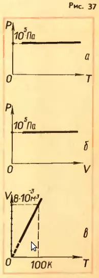Решение. На графиках зависимости p от T и p от V изобара будет представлять собой прямую, параллельную либо оси T, либо оси V (рис. 37, а и б).